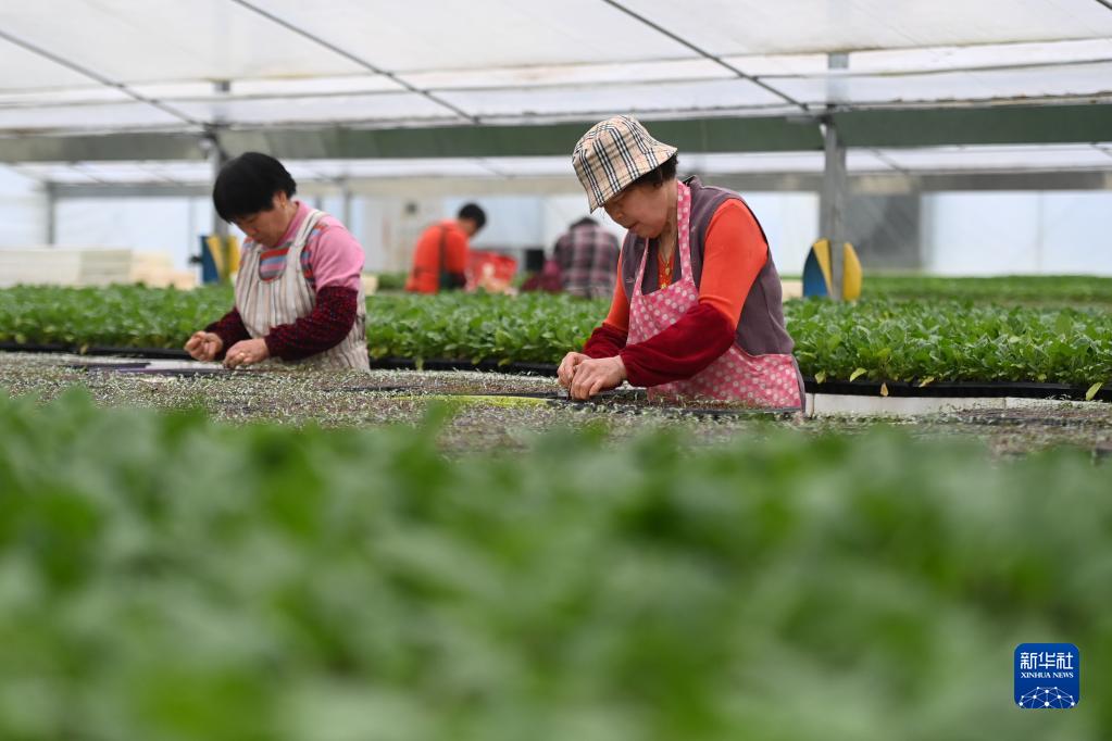 3月8日,工作人員在杭州市臨平區(qū)的杭州康成農(nóng)業(yè)科技有限公司的溫室內(nèi)查看菜苗長(zhǎng)勢(shì)。