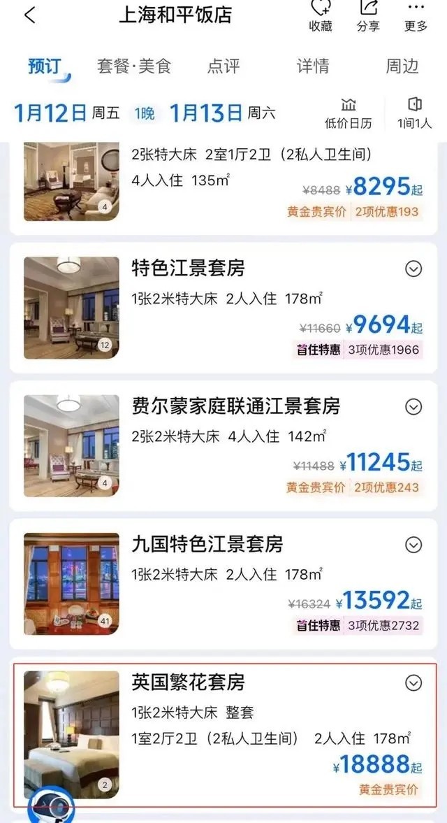 劇中出鏡率極高的和平飯店英國套房也成了“熱門產品”。目前,和平飯店英國套房在旅游平臺上被命名為“英國繁花套房”。9日查詢攜程旅行平臺發(fā)現(xiàn),9-11日該套房已售罄,12日入住一晚的價格為18888元。據(jù)媒體此前報道,這一套房在今年春節(jié)期間含早價為22888元一晚。