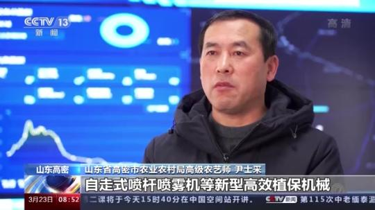 山東省高密市農業(yè)農村局高級農藝師 尹士采:我們利用植保無人機、自走式噴桿噴霧機等新型高效植保機械,開展小麥病蟲草害統防統治,同時加強對農戶、家庭農場的指導服務。
