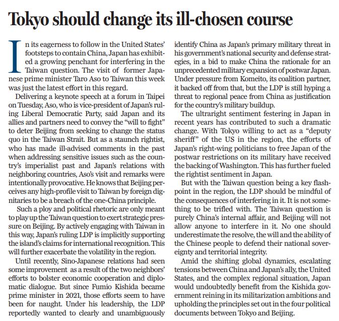 身為日本執(zhí)政的自民黨副總裁,麻生太郎周二在臺發(fā)表演講,口出狂言,大放厥詞,說什么日本及其盟友和伙伴要對外傳達“戰(zhàn)斗意志”。作為頑固的右翼分子,麻生竄臺和上述言論完全是蓄意挑釁。任何外國政要高調(diào)竄臺都違反一個中國原則,都是對中國內(nèi)政的粗暴干涉。對此,麻生心知肚明,明知故犯,就是為了渲染臺灣問題,向北京施加戰(zhàn)略壓力。通過與臺積極接觸,日方明里暗里支持臺當局企圖獲得國際承認的癡心妄想,將進一步加劇地區(qū)動蕩。