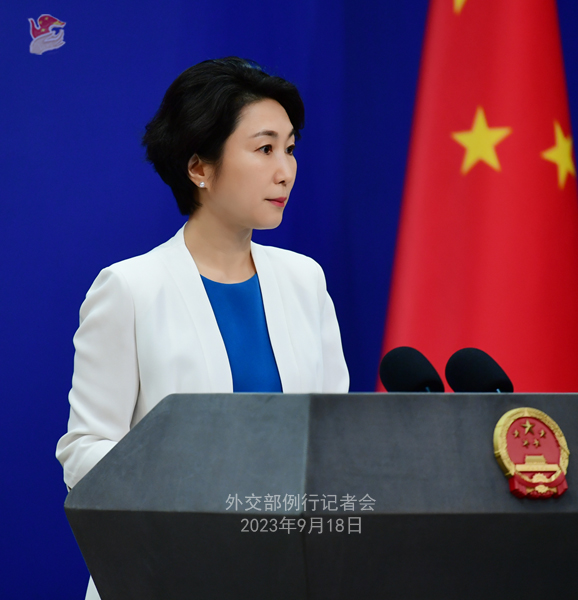 中新網(wǎng)北京9月18日電 (謝雁冰)中國(guó)外交部發(fā)言人毛寧9月18日主持例行記者會(huì)。