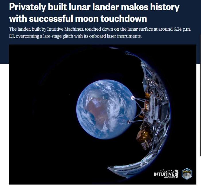 據(jù)報(bào)道,由“直覺(jué)機(jī)器” 研發(fā)的著陸器于美東時(shí)間下午6點(diǎn)23分左右降落在月球表面。該著陸器是自1972年“阿波羅17號(hào)”任務(wù)以來(lái)第一艘登上月球的美國(guó)航天器。
