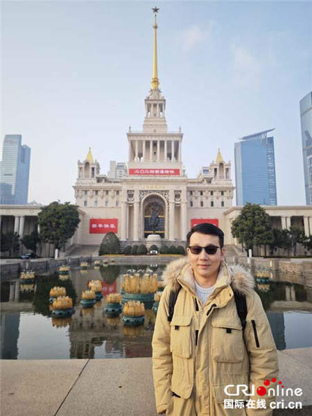 蔡孟軒在上海展覽中心(中蘇友好大廈舊址)前留影(供圖:蔡孟軒)