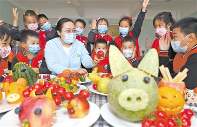 5月20日是“中國學(xué)生營養(yǎng)日”。近日,山東省東營市東營區(qū)一家幼兒園里,師生把五顏六色的水果、蔬菜制作成各種造型,并在制作過程中了解各種水果、蔬菜的營養(yǎng)價值,引導(dǎo)孩子們不挑食、不偏食,拒絕浪費,樹立健康飲食觀念。