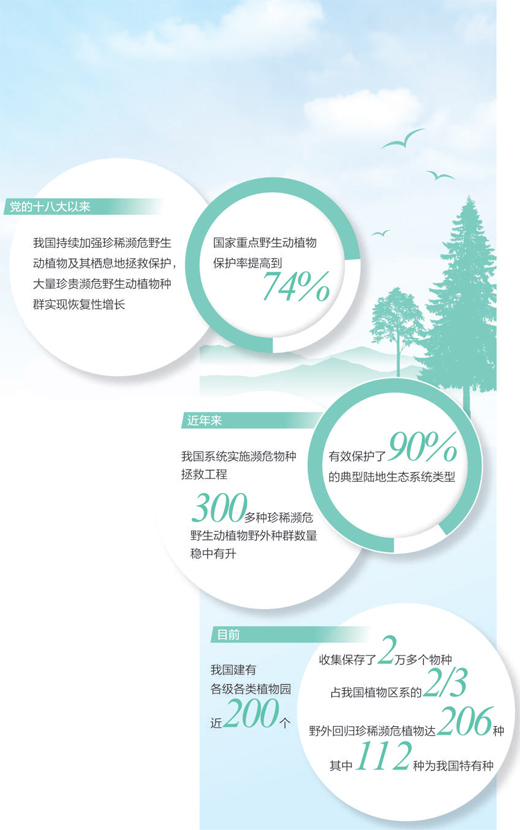 近年來,我國系統(tǒng)實(shí)施瀕危物種拯救工程,采取就地保護(hù)、遷地保護(hù)、放歸(回歸)自然、人工繁育(培植)等措施,有效保護(hù)了90%的典型陸地生態(tài)系統(tǒng)類型,300多種珍稀瀕危野生動(dòng)植物野外種群數(shù)量穩(wěn)中有升。目前,我國建有各級(jí)各類植物園近200個(gè),收集保存了2萬多個(gè)物種,占我國植物區(qū)系的2/3。野外回歸珍稀瀕危植物達(dá)到206種,其中112種為我國特有種。麋鹿、普氏野馬曾一度在野外消失,目前通過人工繁育等方式,總數(shù)分別達(dá)近1萬只和700只左右,并成功實(shí)施放歸自然,重新建立了野外種群,生存區(qū)域和范圍不斷擴(kuò)大。