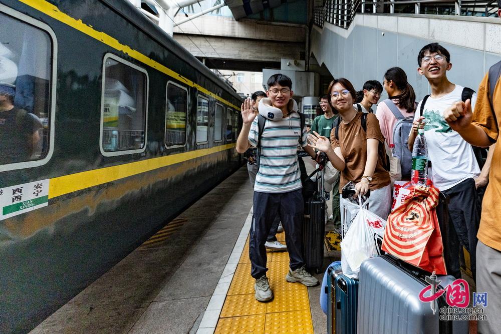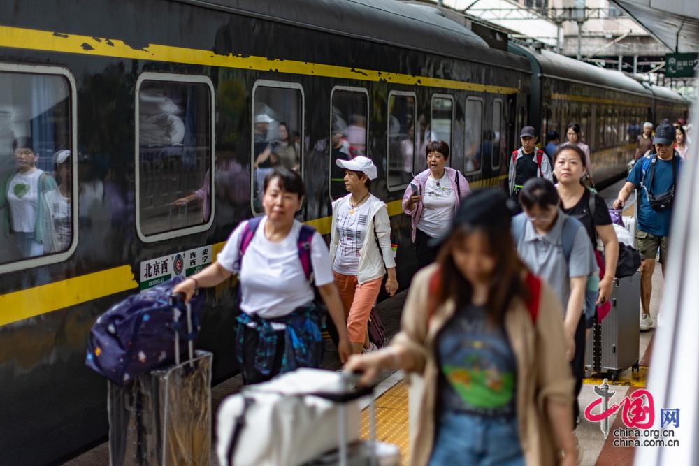 7月1日13時(shí)05分,450名游客乘坐“京藏號(hào)”旅游列車從北京西站出發(fā),即將開啟14天的旅途。