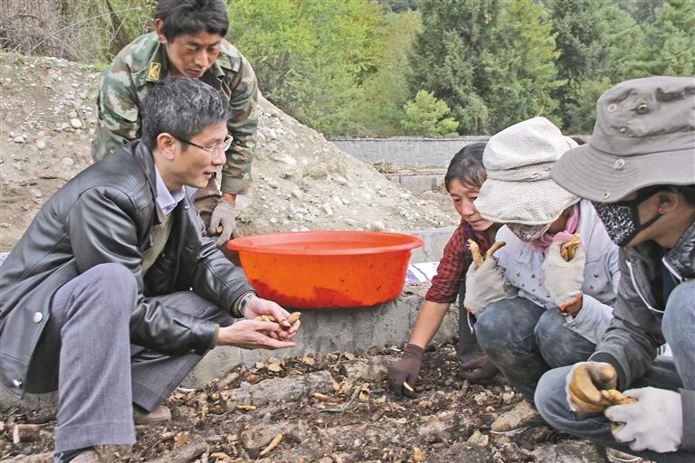 廣東省第七批援藏工作隊成員肖國鑫(左一)在波密縣指導(dǎo)當?shù)剞r(nóng)牧民種植天麻。