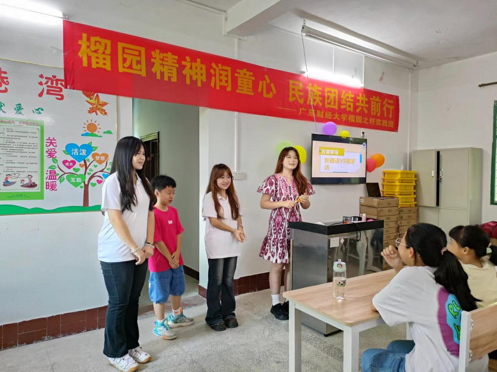 7月7日-7月13日,廣東財(cái)經(jīng)大學(xué)“榴園之籽”實(shí)踐團(tuán)組織了廣財(cái)大的各民族精英大學(xué)生到興寧市開(kāi)展鄉(xiāng)村支教活動(dòng),隊(duì)員們教授民族特色歌舞、繪畫(huà)手工、武術(shù)體育和勞動(dòng)教育等內(nèi)容,助力兒童德智體美勞全面發(fā)展。隊(duì)員們還為兒童展示各民族的文化特色,讓他們感受到不同民族文化的魅力,并通過(guò)講述廣東人民援疆、援藏的事跡,特別是“榴園”校友黃海芬扎根西藏奉獻(xiàn)的事跡,引導(dǎo)孩子們鑄牢中華民族共同體意識(shí)。隊(duì)員們?cè)谥Ы讨袀鬟f“榴園精神”,鼓勵(lì)孩子們一起學(xué)習(xí)“凝心聚力、團(tuán)結(jié)奮斗”的“榴園精神”,激勵(lì)他們勤奮向?qū)W、學(xué)會(huì)感恩,長(zhǎng)大成才后回饋家鄉(xiāng)和社會(huì)。