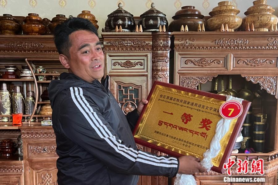 “這是我去年獲得的西藏自治區(qū)首屆農(nóng)牧民國(guó)家通用語(yǔ)言文字演講比賽一等獎(jiǎng),我當(dāng)時(shí)演講的主題就是民族團(tuán)結(jié)。”在林芝鎮(zhèn)嘎拉村黨支部宣傳委員、村委會(huì)副主任尼瑪多吉家中,主人正自豪地向記者們展示著獲獎(jiǎng)牌匾。