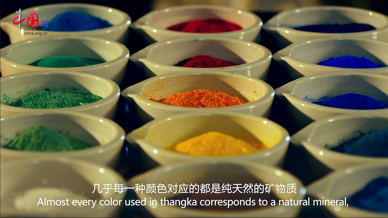 唐卡的色彩為什么璀璨奪目?關(guān)鍵就在這些顏料上,幾乎每一種顏色對應(yīng)的都是純天然的礦物質(zhì),諸如金、珍珠、綠松石等,精心研磨而成,經(jīng)久而不衰。