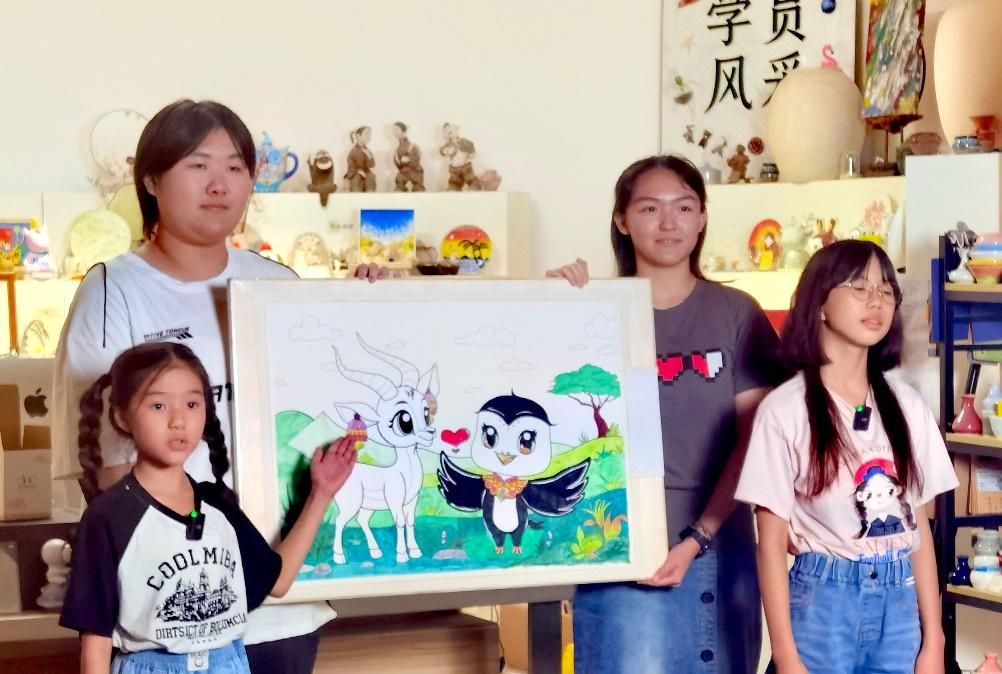 活動期間,北京的劉心語、吳梓菡、文藝、吳辰希與西藏的旦增雍措、旦增尼瑪、徐杰、索朗央珍等兩地青少年代表,通過“同繪一幅畫”的方式,將西藏的藏羚羊與北京的雨燕巧妙地融合在一個畫面之中。畫作中,一邊是象征北京自由與活力的“空中旅行家”雨燕在無邊的藍天中翱翔,另一邊則是代表西藏堅韌與生機的藏羚羊在遼闊的無人區(qū)自由奔跑。盡管兩者習(xí)性迥異、棲息地不同,它們共同展現(xiàn)了自由無束的特質(zhì),寓意著京藏兩地青少年盡管生活在不同的文化環(huán)境中,卻都能追求自由和快樂的成長。正如北京的孩子們說:“我們把來自拉薩的藏羚羊和來自北京的小雨燕聚集到一起,畫在了一個畫面中??矗翰亓缪虼髦刈宥棧∮暄嗌碇祁I(lǐng)服飾,她們是盛裝出席啊。就像我們,北京和西藏的同學(xué)們,手拉著手,心連著心,書信往來,學(xué)習(xí)探究,相互幫助,一起成長?!蔽鞑氐暮⒆诱f:“我們就像畫中的藏羚羊和北京雨燕一樣,心手相牽,互相鼓舞,用積極的態(tài)度學(xué)習(xí)、生活,成為祖國的好少年!”。