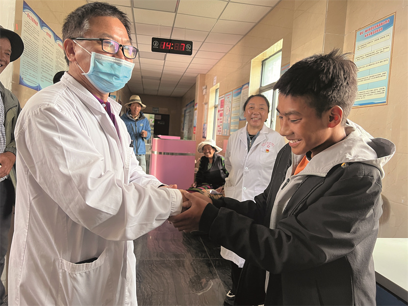 桑丁與張新輝醫(yī)生握手表達感謝。德吉卓瑪 攝