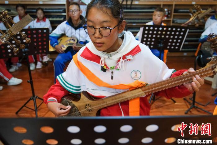 2024年9月9日,西藏山南浪卡子縣中學(xué)初二年級(jí)學(xué)生白瑪卓嘎學(xué)習(xí)彈六弦琴?!≈行律缬浾?江飛波 攝