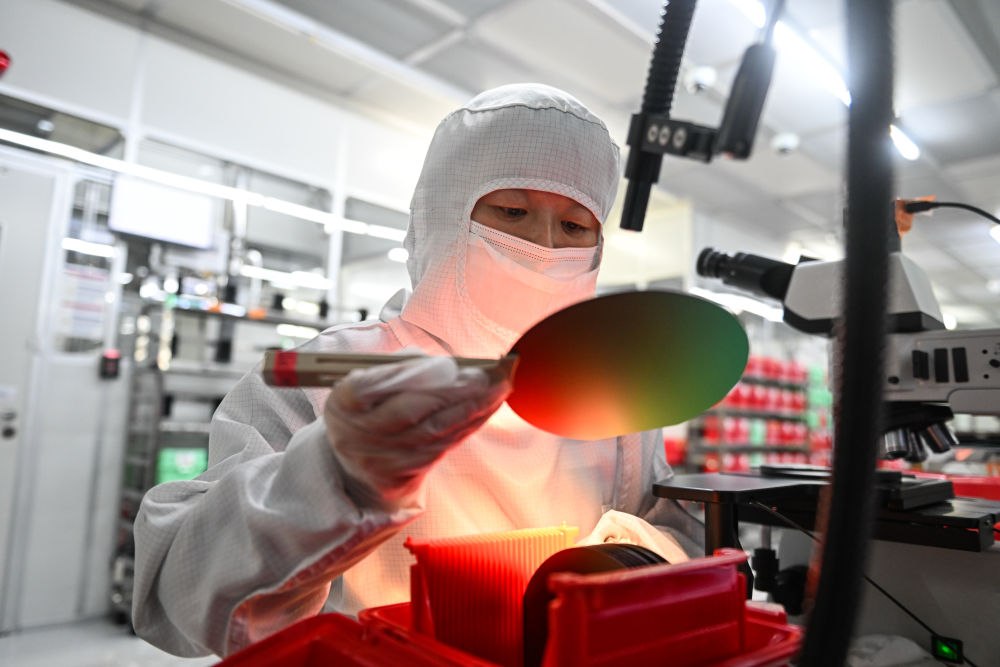 在蘇州工業(yè)園區(qū)納米產(chǎn)業(yè)技術(shù)研究院有限公司,工作人員在生產(chǎn)車(chē)間檢查晶圓質(zhì)量(2024年11月12日攝)。新華社記者 季春鵬 攝