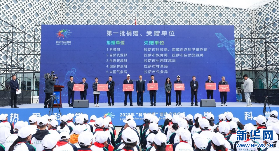 國家林草局科技司帶隊(duì)出席啟動儀式,并組織有關(guān)單位向拉薩市林草局捐贈林草科普物資。(新華社發(fā) 宋平 攝)