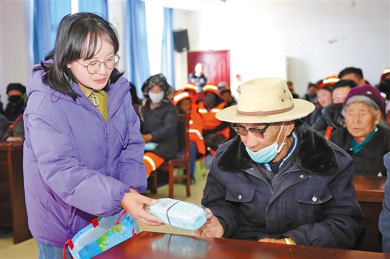 圖為工作人員向群眾贈(zèng)送印有法治知識(shí)的禮品。