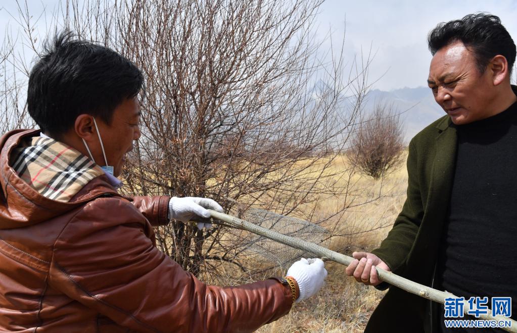 3月30日,索朗羅布(右)給樹(shù)裝上“防鼠套”。新華社記者 覺(jué)果 攝