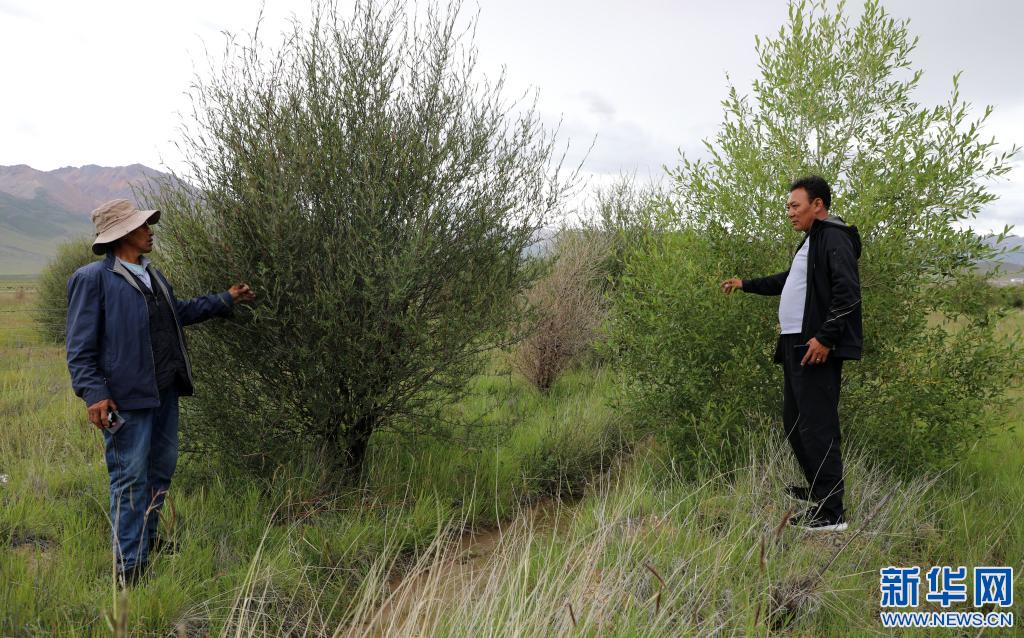 索朗羅布(右)在檢查樹(shù)的長(zhǎng)勢(shì)(2020年8月8日攝)。新華社記者 覺(jué)果 攝