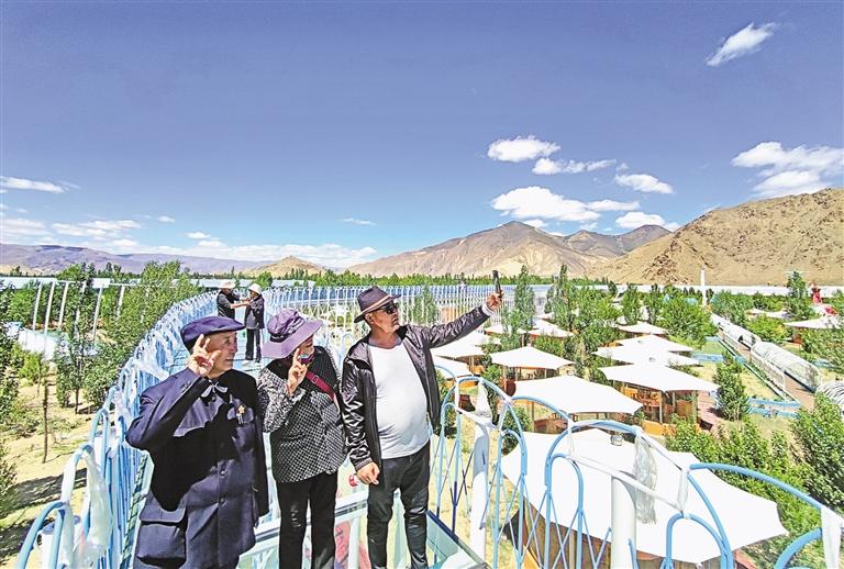 昔日山溝荒地,今日旅游盛景。走進(jìn)西普農(nóng)博園,穿過(guò)一段五彩斑斕的“時(shí)光隧道”燈光秀場(chǎng),園內(nèi)美景浮現(xiàn)在眼前,仿佛進(jìn)入了世外桃源。果蔬花卉爭(zhēng)奇斗艷,西藏車?yán)遄?、?yáng)光玫瑰葡萄正吸吮陽(yáng)光雨露不斷成熟;高原風(fēng)光沁人心脾,青樸山、雅魯藏布江盡收眼底;運(yùn)動(dòng)康養(yǎng)放松身心,游泳池、玻璃棧道、高空秋千讓人活力迸發(fā);休閑娛樂(lè)花樣繁多,圍爐煮茶、花園火鍋、親子樂(lè)園等讓幸福生活煥新添彩;研學(xué)探索妙趣橫生,梅花鹿、駱駝、孔雀、鴕鳥(niǎo)等生靈構(gòu)成一幅人與自然和諧相處的美好畫面。