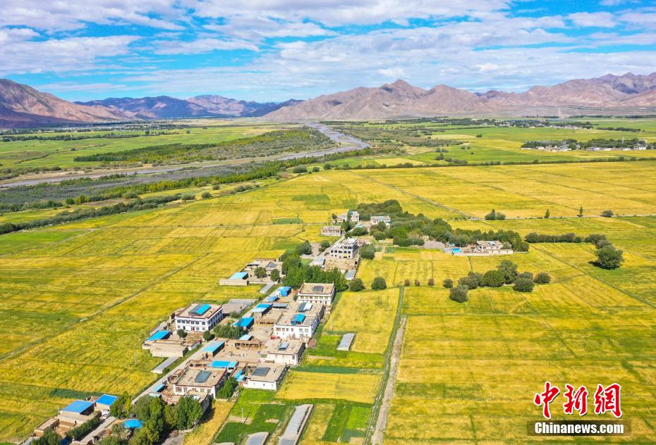 8月25日,西藏日喀則白朗縣仁青崗村,田園、村莊、河流、公路、遠山交相輝映,構(gòu)成一幅美麗的田園風(fēng)光畫卷。(無人機照片)