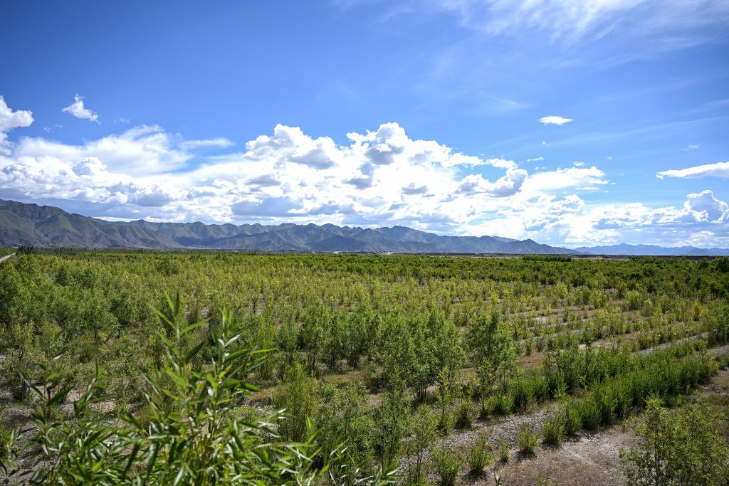 2024年9月1日,在雅江北岸南木林生態(tài)示范區(qū),郁郁蔥蔥的林木和湛藍(lán)的天空相映成景。新華社記者孫瑞博 攝