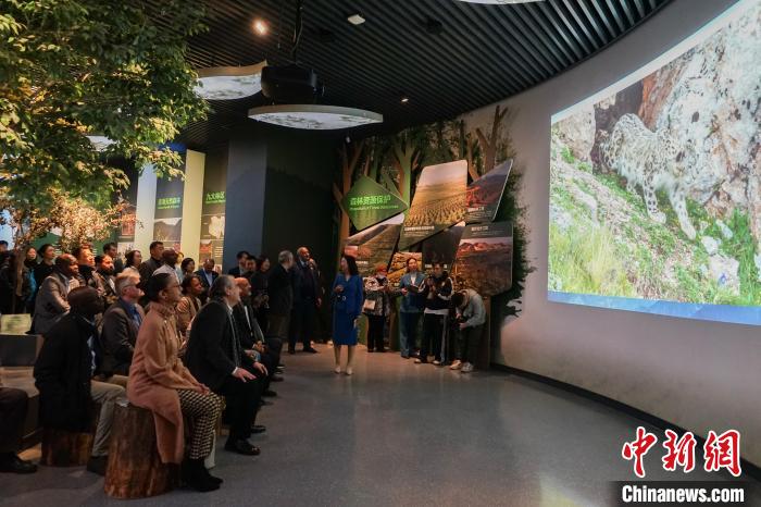 圖為代表團一行在青海省自然資源博物館內觀看高原旗艦物種雪豹的視頻。中新社記者 馬銘言 攝