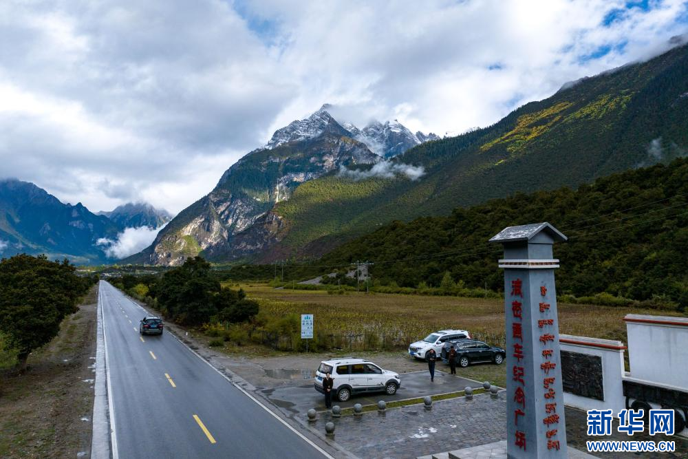 10月11日拍攝的波密通車紀(jì)念廣場(無人機(jī)照片)。2020年,西藏波密縣通過查閱文獻(xiàn)史料、比對老照片、咨詢當(dāng)?shù)乩先?、遠(yuǎn)程連線老一輩同志等方式,考證出當(dāng)時(shí)舉行通車典禮的地點(diǎn)為今波密縣松宗鎮(zhèn)角達(dá)村國道318旁。為紀(jì)念這一歷史事件,2021年4月波密縣在此處修建了波密通車紀(jì)念廣場。新華網(wǎng) 旦增努布 攝