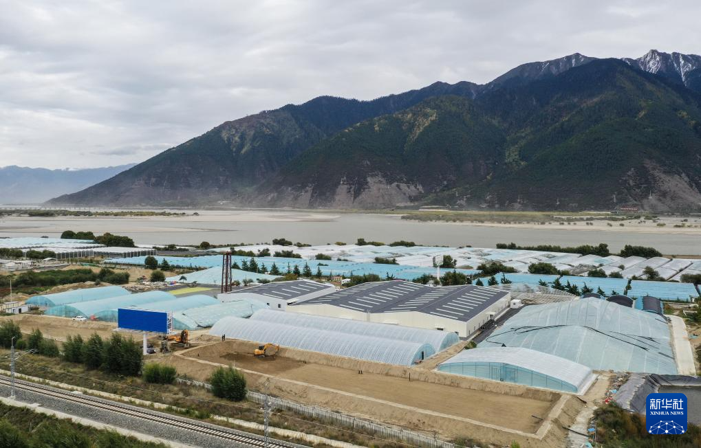 在西藏林芝市米林農場內的粵林高原漁業(yè)科技園,依托當地有利環(huán)境而興建的養(yǎng)殖育種基地初顯規(guī)模(無人機照片,10月24日攝)。新華社記者 李賀 攝