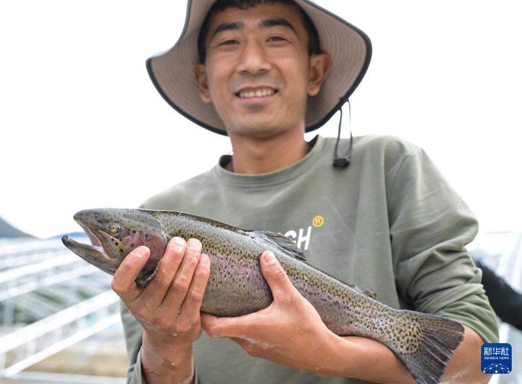 在西藏林芝市米林農場的粵林高原漁業(yè)科技園工作的藏族小伙尼瑪旺堆在展示本地飼養(yǎng)的虹鱒魚(10月24日攝)。新華社記者 李賀 攝