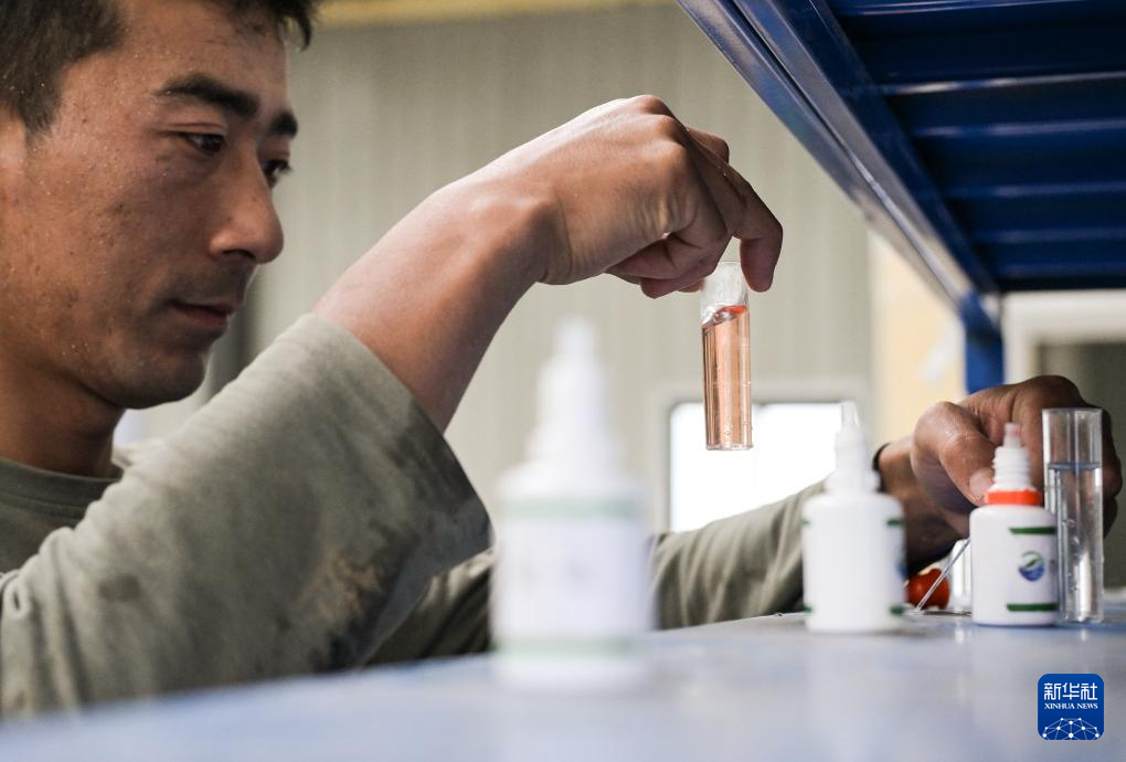在西藏林芝市米林農場的粵林高原漁業(yè)科技園工作的藏族小伙尼瑪旺堆在冷水魚養(yǎng)殖大棚內檢測水樣(10月24日攝)。新華社記者 李賀 攝