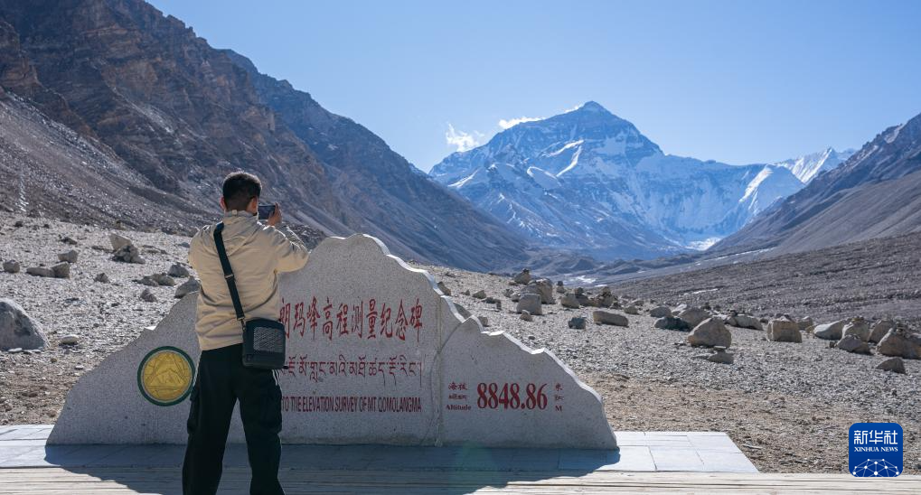 12月14日,游客在珠穆朗瑪峰高程測量紀(jì)念碑前拍照留念。新華社記者 丁增尼達(dá) 攝