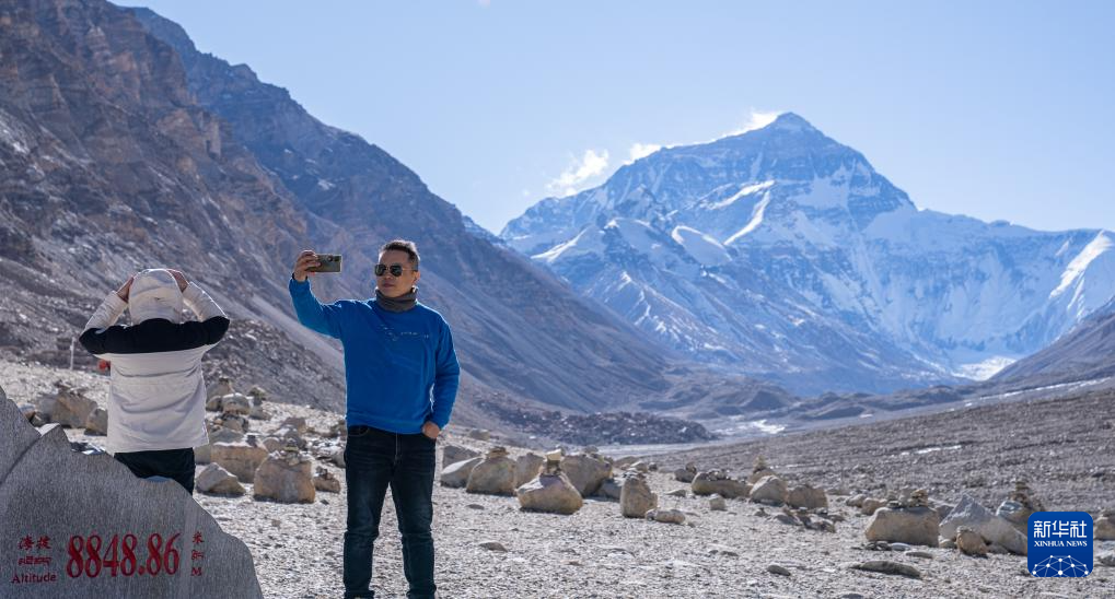 12月14日,游客在珠穆朗瑪峰高程測量紀(jì)念碑旁拍照留念。新華社記者 丁增尼達(dá) 攝