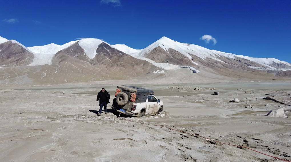 巡山隊(duì)員駕駛的車輛在布喀達(dá)坂峰山腳下陷入雪地中等待施救(攝于2025年1月14日)。新華社記者 杜笑微 攝