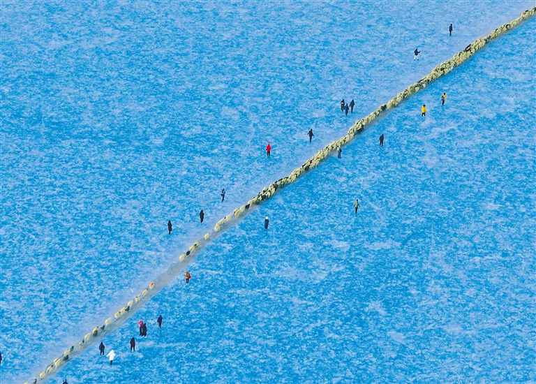 清晨,當(dāng)?shù)谝豢|陽(yáng)光灑在冰面上,牧民便開(kāi)始了他們的旅程。穿著傳統(tǒng)服飾的老爺爺帶頭驅(qū)趕著羊群踏上冰面。羊群沿著爐灰鋪成的小路緩緩前行,宛如一條長(zhǎng)長(zhǎng)的金色線條,在藍(lán)冰上勾勒出一幅亮麗畫卷。途中,偶爾會(huì)有小羊因冰面濕滑而摔倒,牧民總是及時(shí)將它們扶起,或背或抱地送到島上。