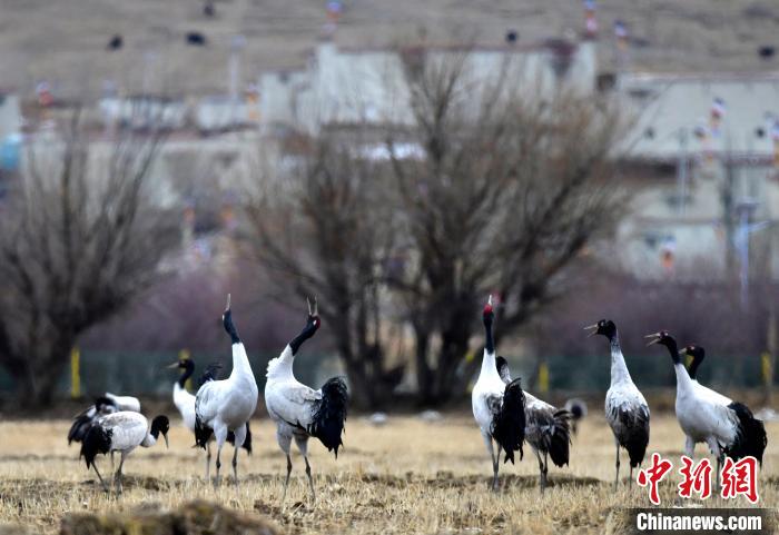 黑頸鶴是全球十五種鶴類中唯一在高原地區(qū)繁殖和越冬的鶴類,被譽(yù)為“高原神鳥”,屬中國(guó)國(guó)家一級(jí)保護(hù)動(dòng)物。每年10月中下旬左右,黑頸鶴陸續(xù)飛抵雅魯藏布江中游河谷等地越冬。圖為3月8日,西藏拉薩林周縣黑頸鶴保護(hù)區(qū),黑頸鶴在田間覓食、嬉戲。中新社記者 李林 攝