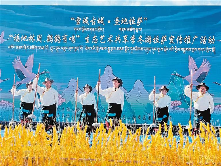 當(dāng)溫暖的陽光輕柔地灑在拉薩河谷,黑頸鶴清脆的鳴叫聲喚醒了林周濕地寧靜的清晨。“福地林周·鶴鶴有鳴”生態(tài)藝術(shù)共享季之“冬游拉薩”宣傳推廣活動,以歌舞表演、生態(tài)主旨演講、黑頸鶴攝影作品展、鶴文化專家座談等,融合了生態(tài)、藝術(shù)與文化的盛宴,讓人在雪山、湖泊與鶴影交織的詩意中,感受“冬游拉薩”的獨(dú)特魅力。