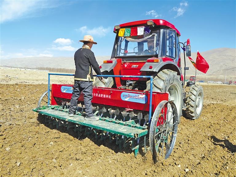 春耕儀式上,隆子縣隆子鎮(zhèn)葉巴村村民駕駛播種機(jī)播種黑青稞。