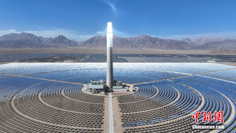 4月15日,航拍位于青海省海西蒙古族藏族自治州德令哈市境內(nèi)的青海中控50MW光熱電站,如戈壁灘上的“藍(lán)色海洋”。該光熱電站是中國首批光熱發(fā)電示范項(xiàng)目之一,也是全球首個年發(fā)電量超過年設(shè)計(jì)發(fā)電量的塔式熔鹽儲能光熱電站。裝機(jī)容量達(dá)50MW,鏡場采光面積達(dá)54.27萬平方米,配置有7小時熔鹽儲能系統(tǒng),每年可節(jié)約標(biāo)準(zhǔn)煤約4.8萬噸,減排二氧化碳?xì)怏w約12.4萬噸。(無人機(jī)照片)