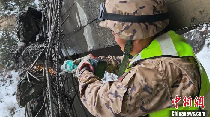 4月26日14時,武警官兵抵達然烏棚洞災(zāi)害現(xiàn)場,立即協(xié)助交警部門對受災(zāi)路段實施管控,并協(xié)調(diào)地方力量展開清理工作。由于棚洞頂部垂吊物夾雜鋼筋,機械難以徹底清除,武警官兵使用切割機對鋼筋進行精準(zhǔn)切割,加快搶通進度。