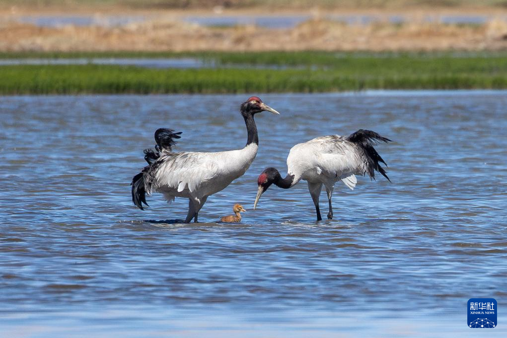 2024年6月9日,一對黑頸鶴帶著雛鳥在西藏那曲市申扎縣一處濕地棲息、覓食。新華社記者 旦增尼瑪曲珠 攝