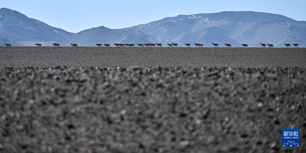 在羌塘國(guó)家級(jí)自然保護(hù)區(qū)核心區(qū)拍攝的遷徙中的雌藏羚羊群(6月9日攝)。新華社記者 旦增尼瑪曲珠 攝