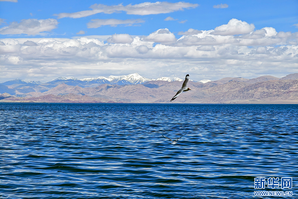 班公湖上飛翔的鳥兒(6月15日攝,無人機(jī)照片)。新華網(wǎng) 旦增努布 攝