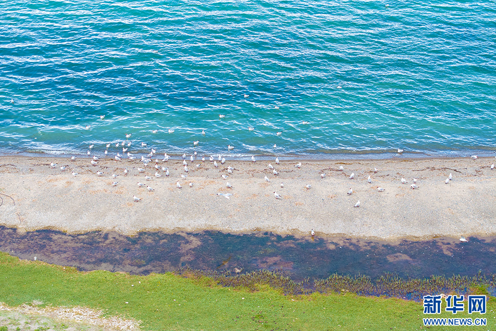 班公湖湖邊覓食的鳥類(6月15日攝,無人機(jī)照片)。新華網(wǎng) 旦增努布 攝