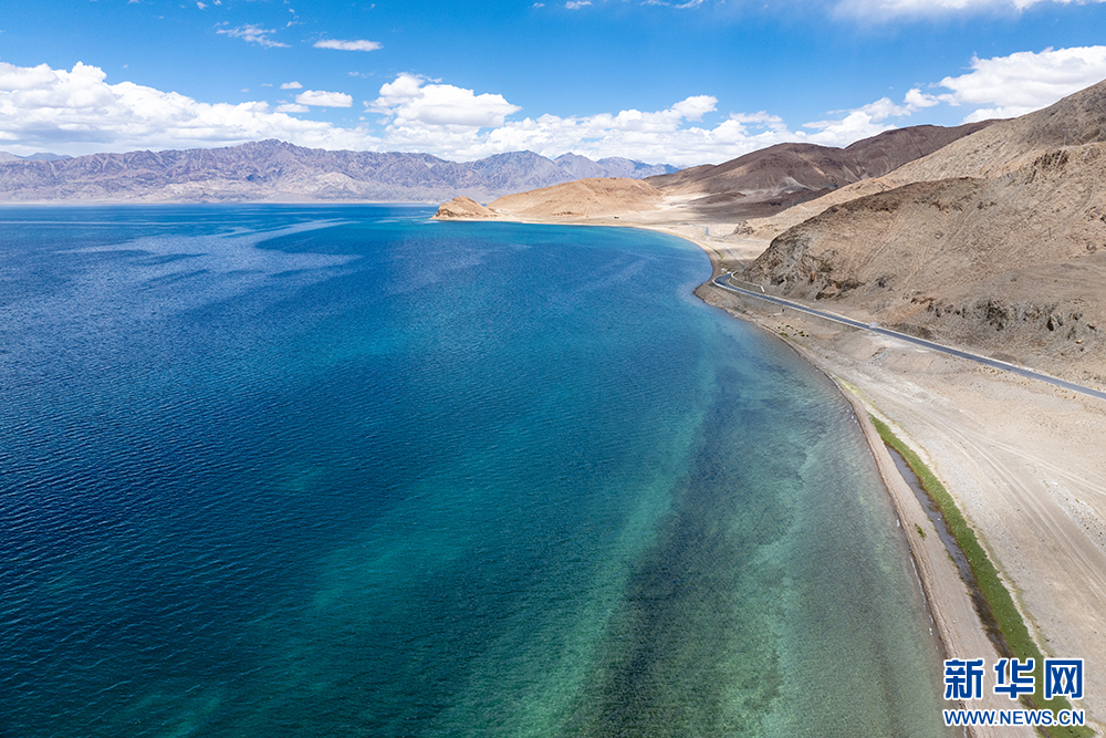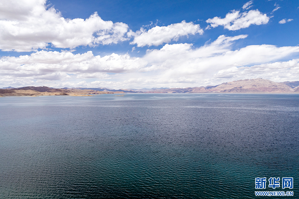 藍(lán)天白云映襯下的班公湖(6月15日攝,無人機(jī)照片)。新華網(wǎng) 旦增努布 攝