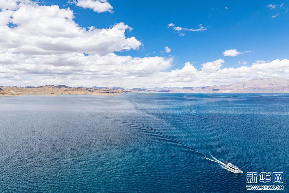 一艘游艇在班公湖上行駛(6月15日攝,無人機(jī)照片)。新華網(wǎng) 旦增努布 攝