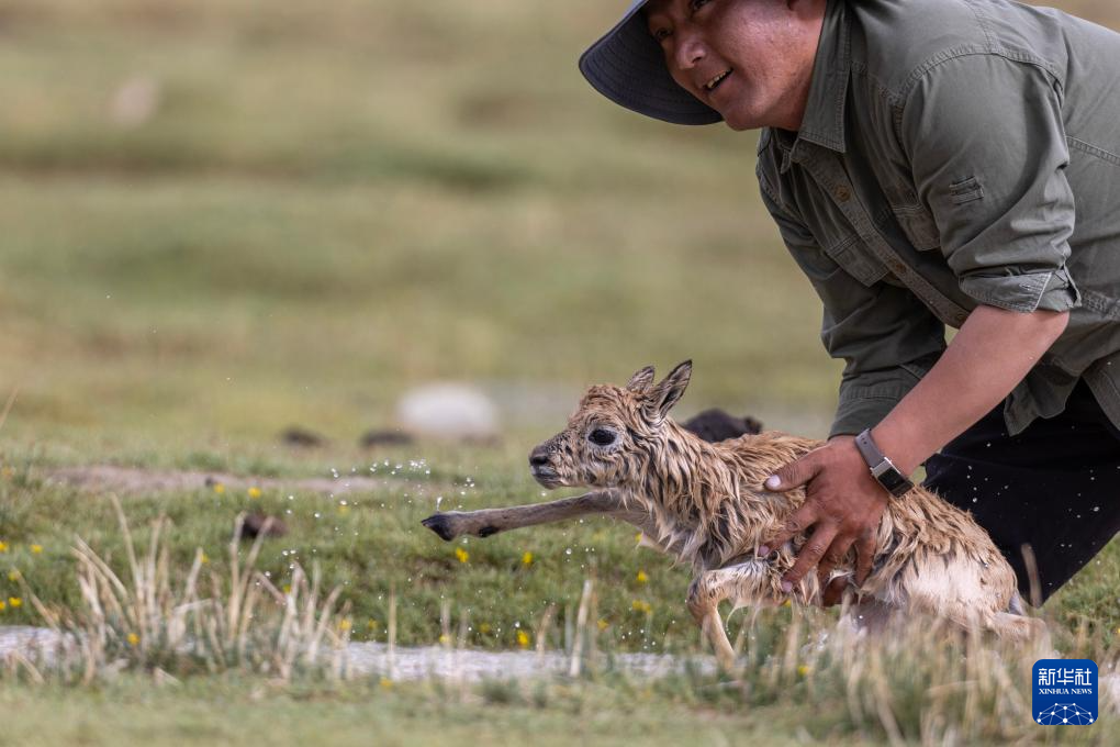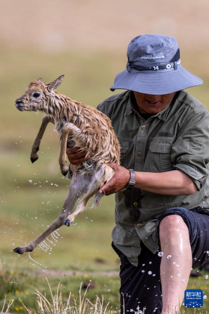 一只被激流沖走的藏羚羊幼崽被管護隊員救上岸(7月14日攝)。新華社記者 姜帆 攝