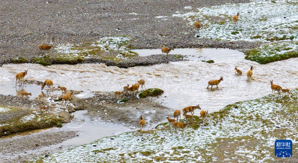 一群帶著幼崽的藏羚羊成功渡過森隆藏布河,幼崽身上水跡未干(7月15日攝)。新華社記者 姜帆 攝