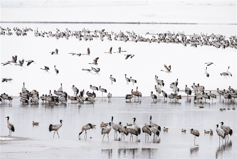 拉薩市林周縣境內(nèi)的黑頸鶴。記者 格桑吉美 攝
