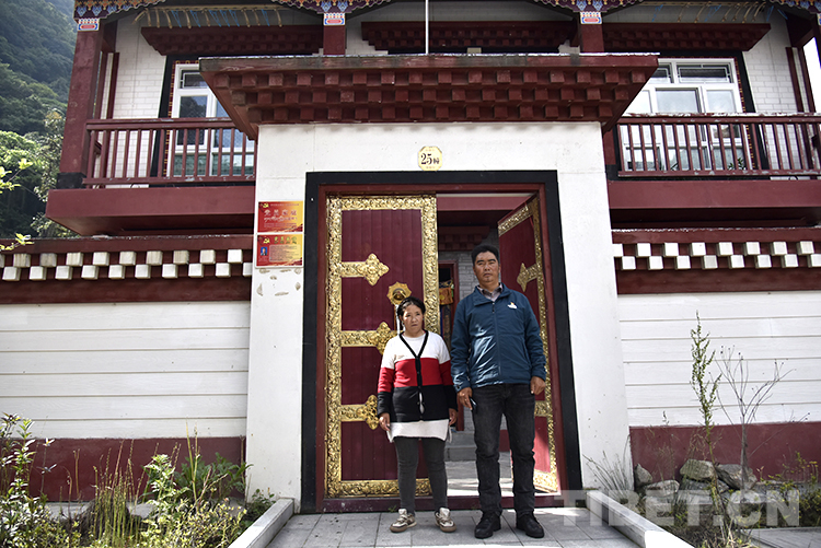 圖為西藏自治區(qū)日喀則市亞東縣龐達(dá)村村民普布扎西(右)和妻子在自家門口 攝影:王媛媛