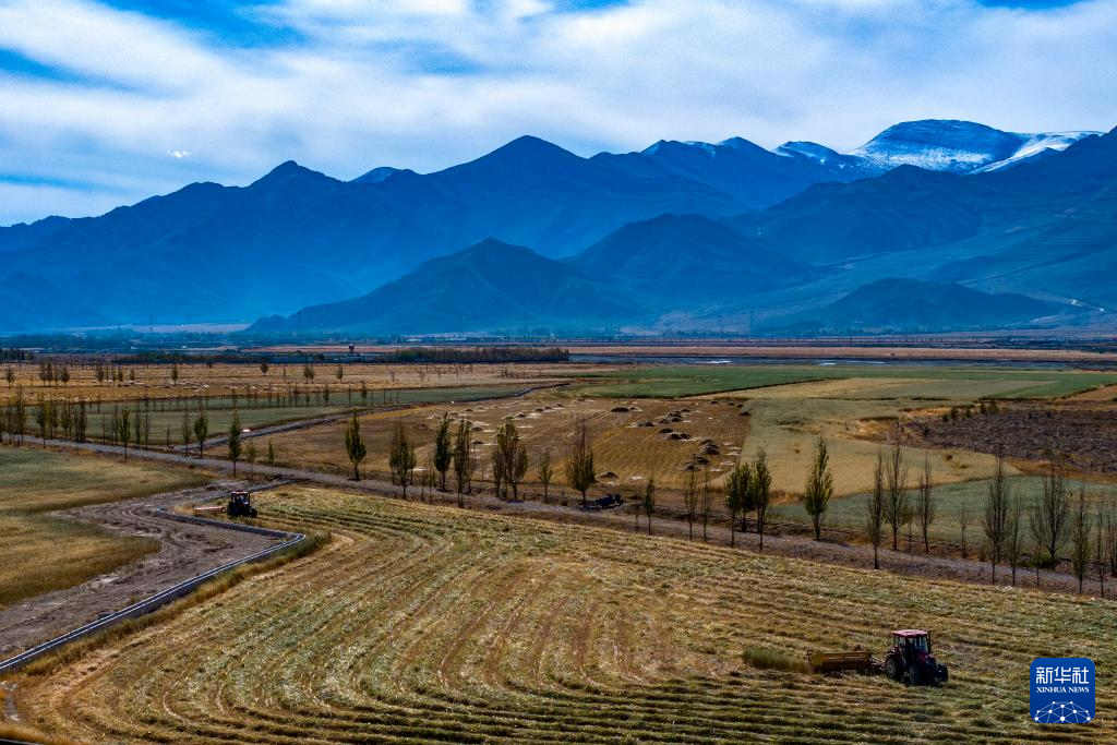 10月24日,村民駕駛農(nóng)機(jī)在拉薩市林周縣強(qiáng)嘎鄉(xiāng)曲嘎強(qiáng)村收割牧草(無(wú)人機(jī)照片)。新華社記者 姜帆 攝